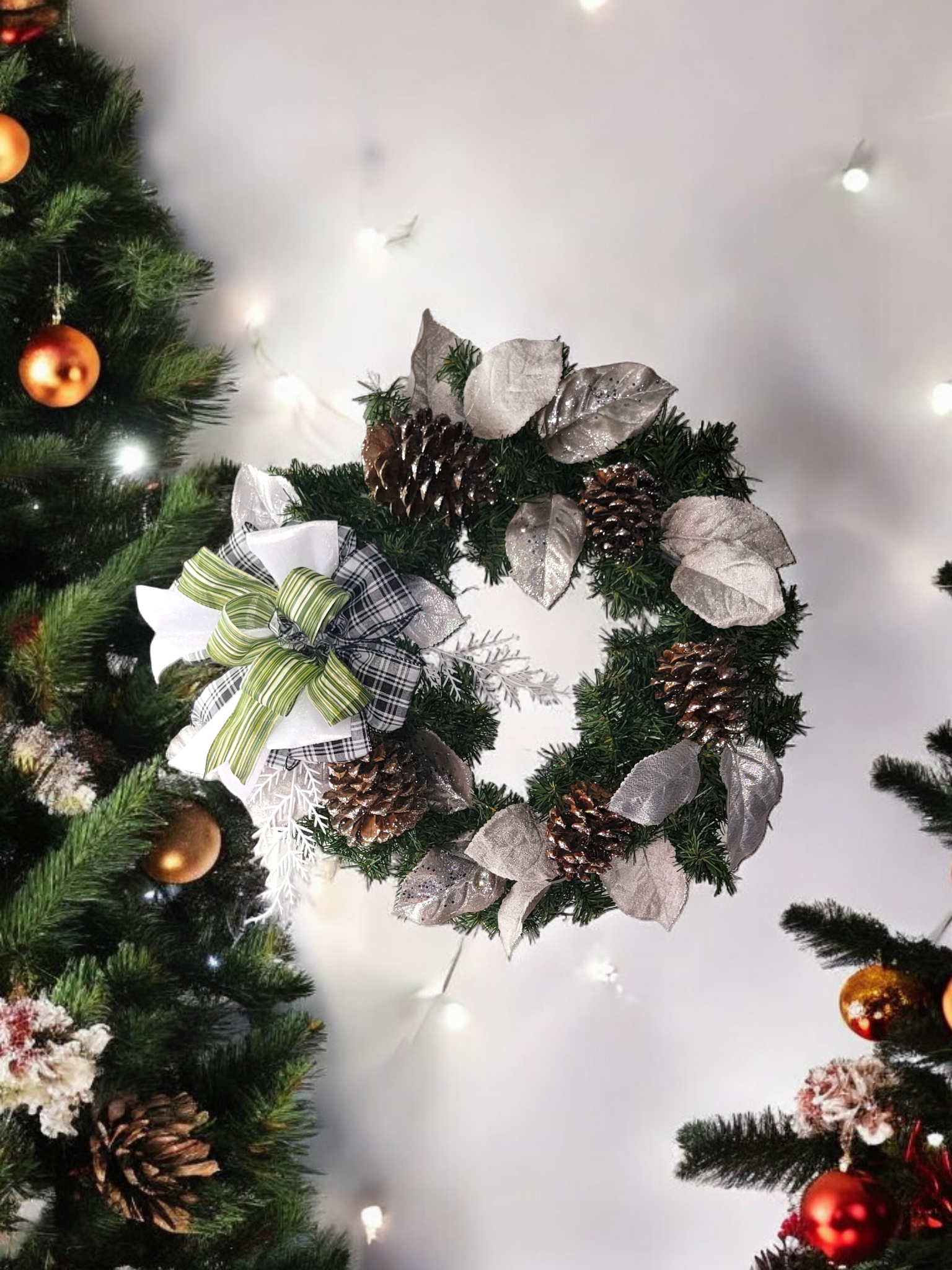 Pine and Pincone Christmas Wreath with a metallic silver Leaf all through out the wreath aligned with real Pincones and a handmade one of a kind Bow. This wil beautifully decorate your front door all Fall season as well as Christmas season.
